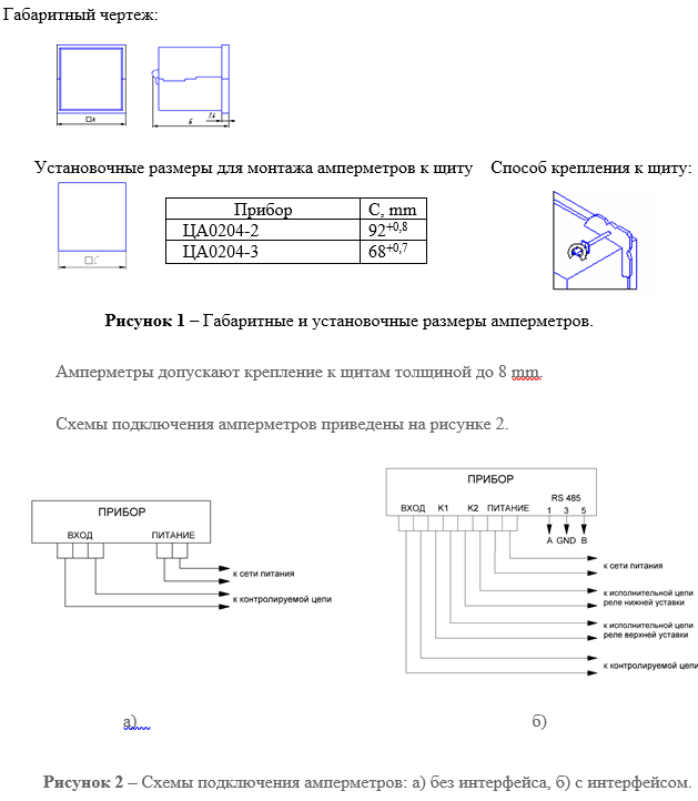 - Габаритные и установочные размеры для монтажа в щит и способ крепления приведены на рисунке 1.