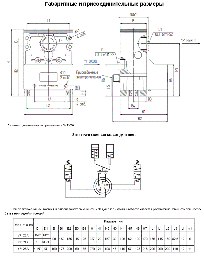 Ниже представлены габаритные и присоединительные размеры Пневмораспределителя У71-22А:
