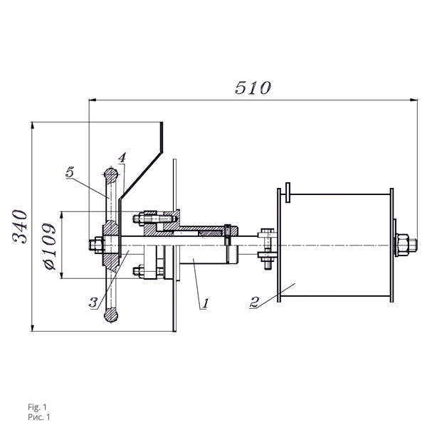 1-корпус, 2-барабан, 3-вал, 4-указатель, 5-маховик. Масса МУ-1 не более 15 кг.