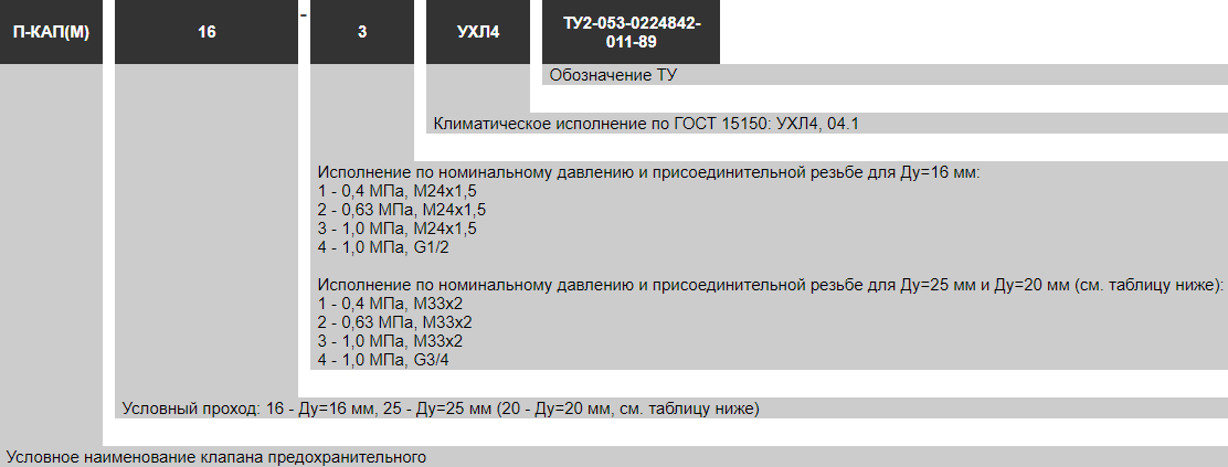 Условное обозначение клапанов П-КАП-16, П-КАП-25
