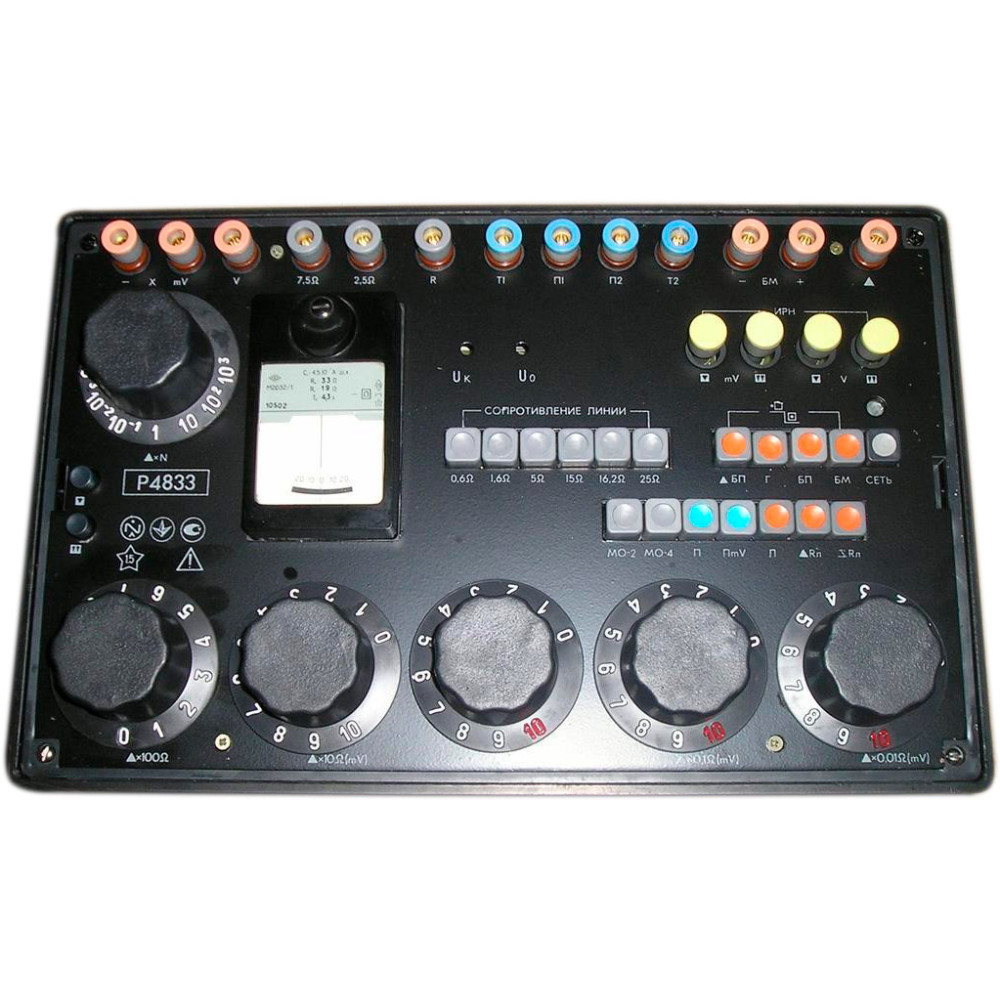 Универсальный измерительный прибор Р-4833 (магазин сопротивлений Р 4833) активно используется для измерения сопротивлений, постоянных ЭДС и U компенсационным методом, измерения сопротивлений мостовым методом. Магазином сопротивления поверяют теплотехнические приборы (автоматических мостов и потенциометров, логометров, милливольтметров), в лабораторных и производственных условиях. Мост Р4833 пректосно заменяет следующие приборы: ПП63, УПИП60М.