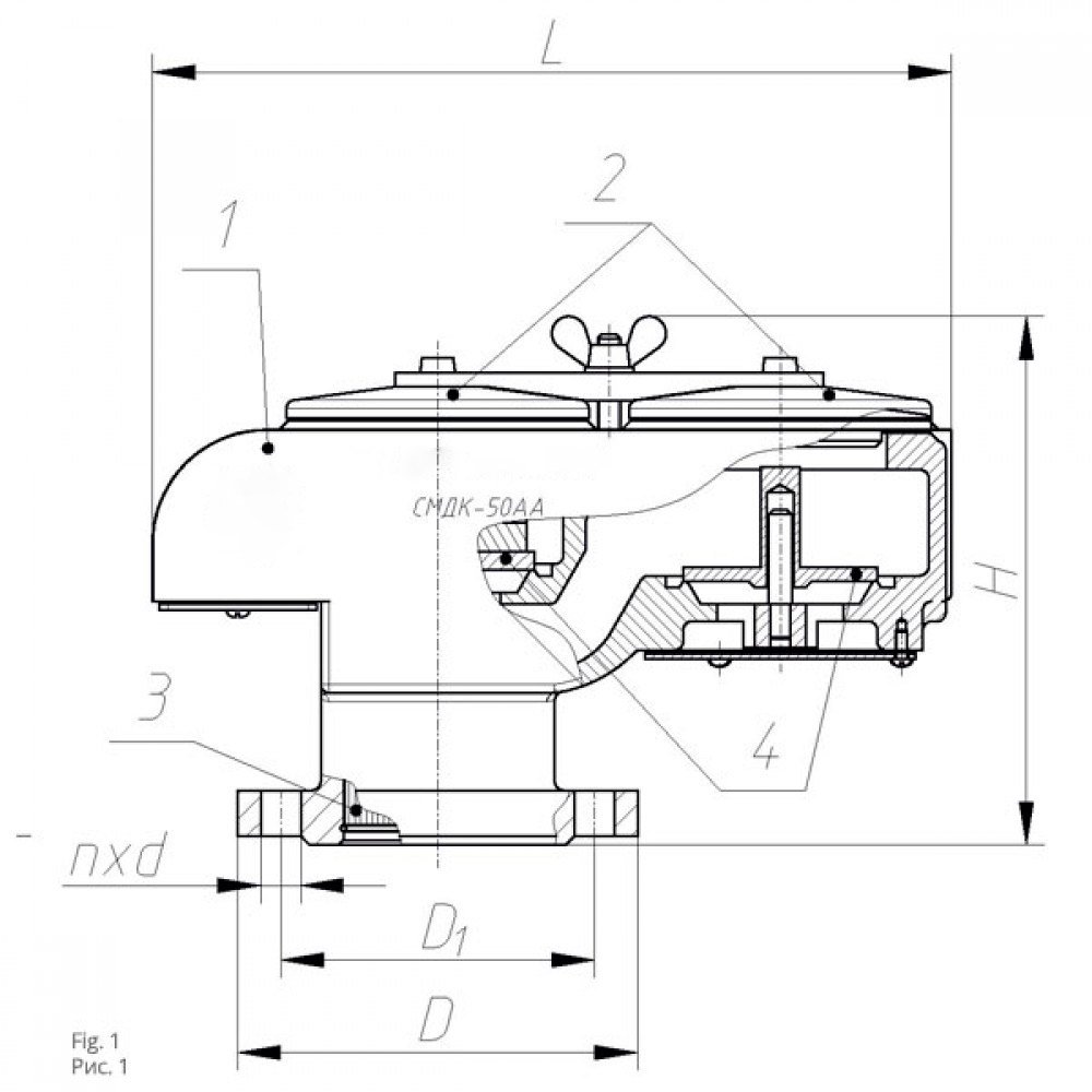 1-корпус, 2-крышка, 3-предохранитель огневой, 4-клапаны. По заказу клапана могут изготовляться на более высокие давления и вакуум.