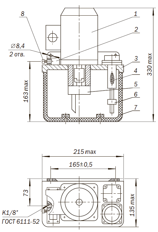 Станция состоит из бака 7, закрытого крышкой 3, к которой крепятся насосная установка в виде шестеренного насоса 5 с электродвигателем 1, клапанная коробка 2 с дросселем 8 выпуска воздуха, реле уровня 6 и заливной фильтр 4 с воздушным фильтром.