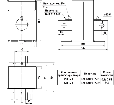 Крепление трансформаторов тока возможно при помощи пластин, которые входят в комплект поставки либо при помощи DIN-рейки, поставляемой по отдельному заказу.