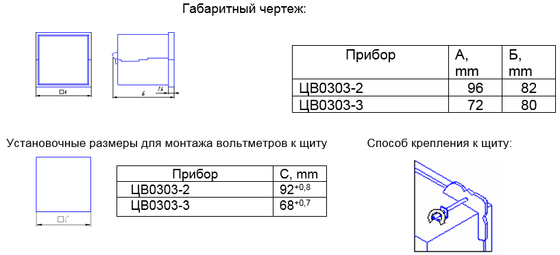 Габаритні і настановні розміри для монтажу в щит і спосіб кріплення наведені на рисунку 1.